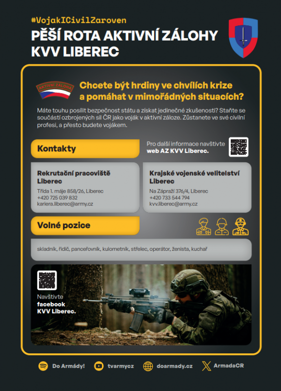 V této sekci naleznete přehled aktuálních volných pozic pro vojáky aktivní zálohy u KVV Liberec s popisem požadovných předpokladů, obsahu činnosti dané funkce či hodnosti